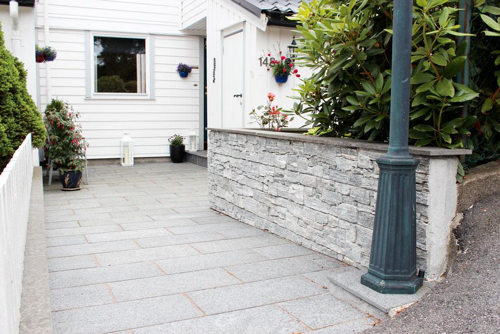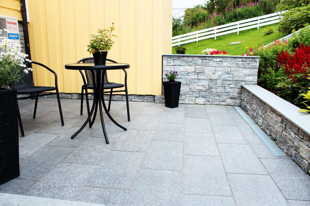 Leverer granitt mur, massive trinn, sålebenker, natursteinsfliser og heller, benker, bord, urner, drensrenner og mye mye mer!